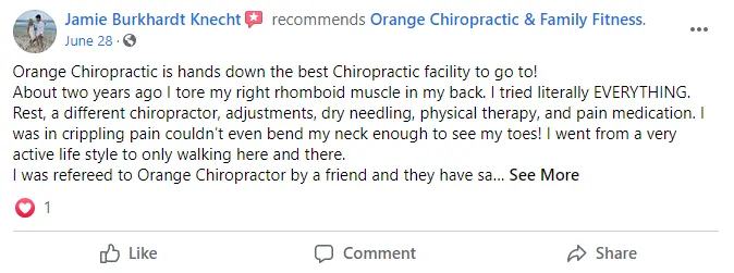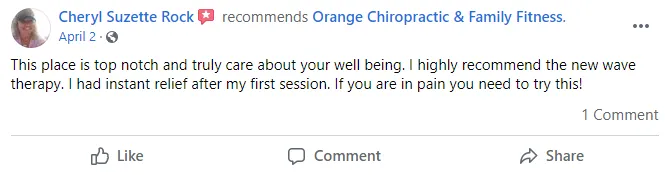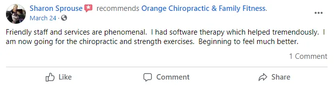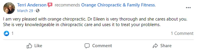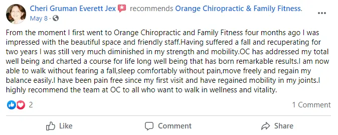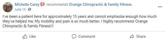 Disclaimer: Procedures and treatments performed by Orange Chiropractic & Family Fitness have an inherent success (and failure) rate. Reviews, testimonials and content on this site should not be interpreted as a statement of efficacy of procedures and treatments performed by Orange Chiropractic & Family Fitness for anyone else.